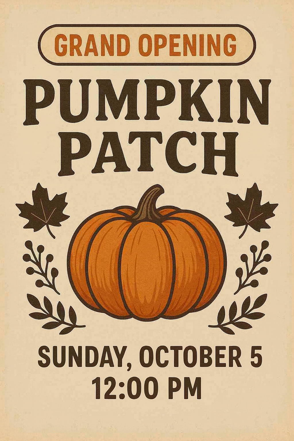 Capture the moment with a complimentary family photo in the pumpkin patch! Our photo spot will be open for free pictures--no signup or appointment required. Families can enjoy a quick pose together, and pets are welcome in the photos. Pictures are taken on a first-come, first-served basis and will be emailed for download.